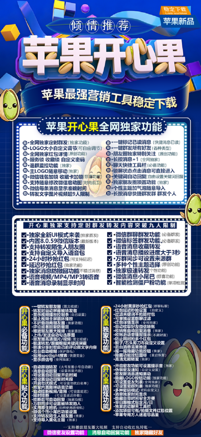 苹果TF开心果-斗战神8059-微信分身-秒抢红包-虚拟视频